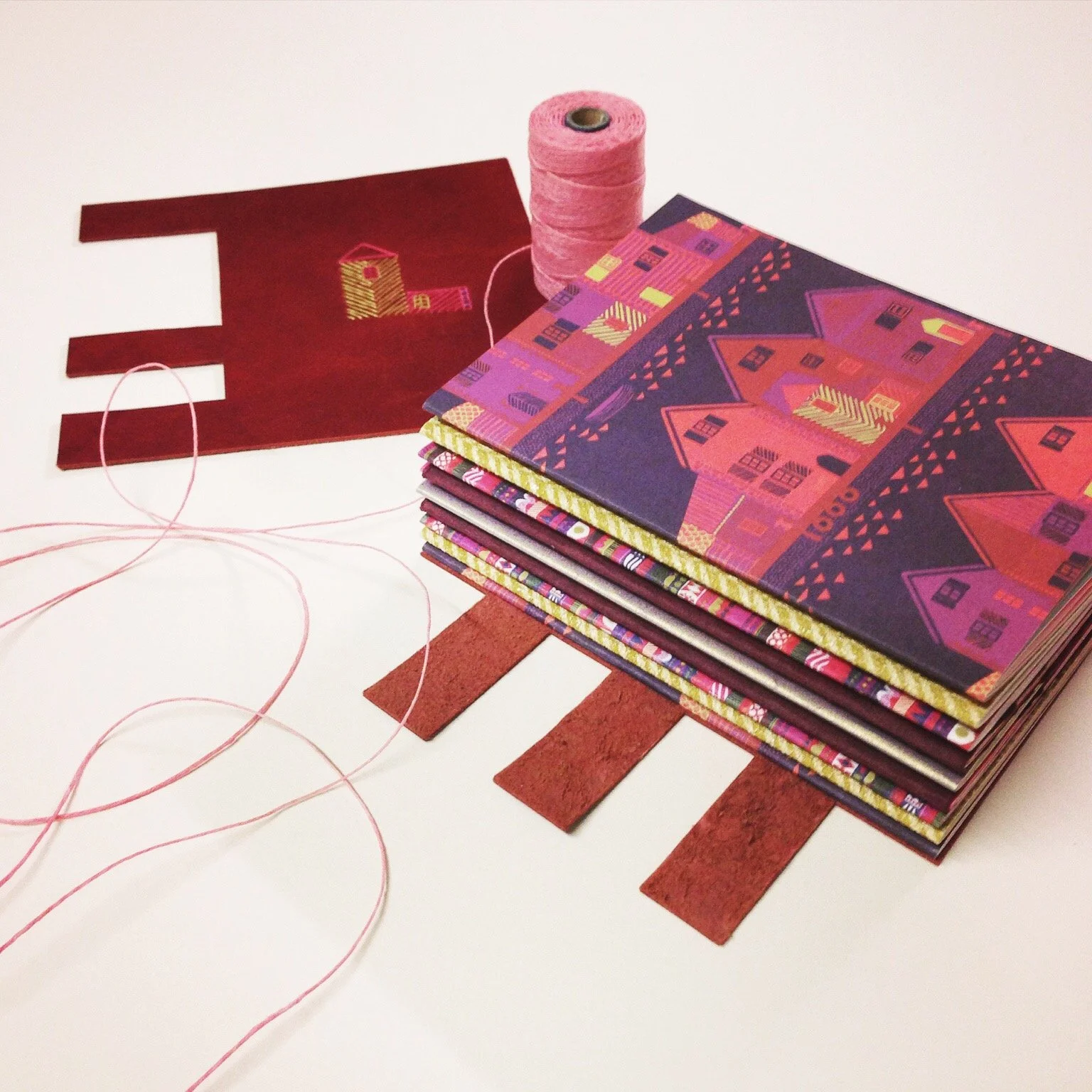 Cross-structure binding has been around since medieval times, and is distinguished by sections of pages sewn onto the leather 'fingers' of the covers, either leaving the colourful stitching exposed or concealing it behind the spine panel of leather (both styles are taught in this class - your choice of which you'd prefer to make).