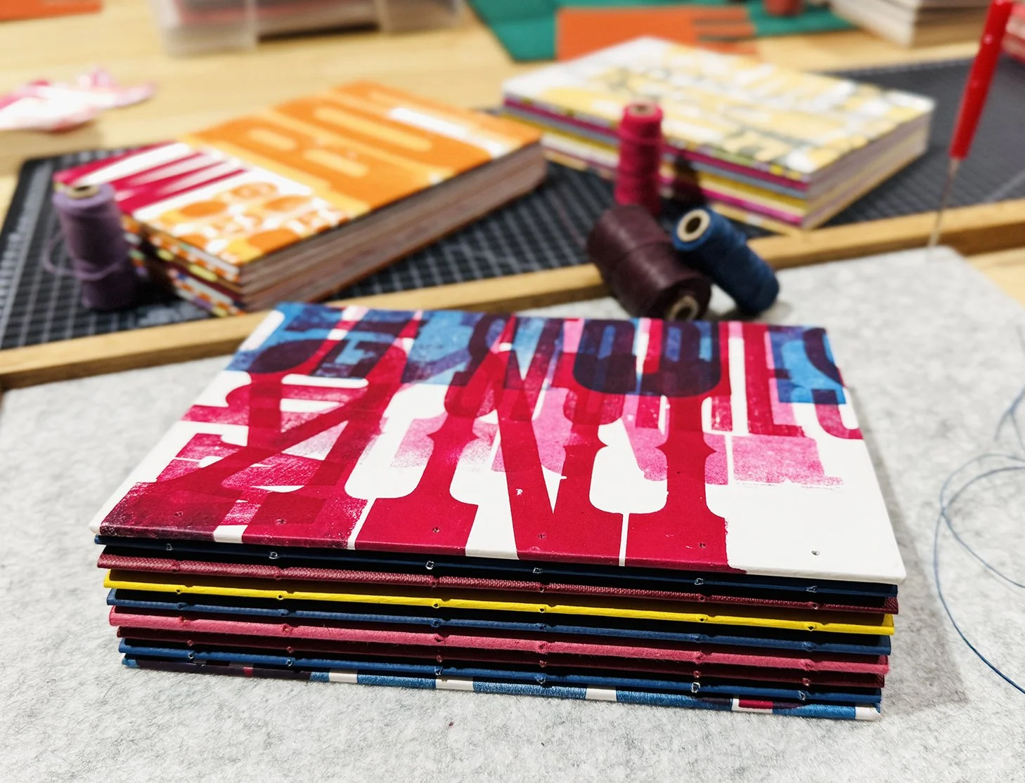 In this Multi-needle Coptic bookbinding workshop, participants will use their letterpress prints (from the day before) to create their own unique A5-sized journal/sketchbook/memento book, with hardboard front/back covers wrapped with letterpress prints (or other selected cover paper), and a variety of different papers inside the book, interleaved with the letterpressed papers as a special feature.